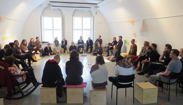 The art of slowing down in order to speed up was such a relevant factor for emerging insights. To ponder all the questions and still be held by the village form was helpful during the closing part of the Learning Village- the “post” village days. We still had some minimalistic structures like a check-in circle in the morning and a very relaxed version of Open Space, Martin as our scribe. A smaller group size allowed flexibility with the logistics – workshops emerged at the right time with the right people, meals were co-organized and sauna was available. We were entering the appreciation part of the process, and Tanja´s ranking workshop was a good add to that. The market place of the Open Space had been shifted more or less to Facebook. It very much reflected the next phase of the process; we were slowly reaching out to the world while harvesting the main insights.